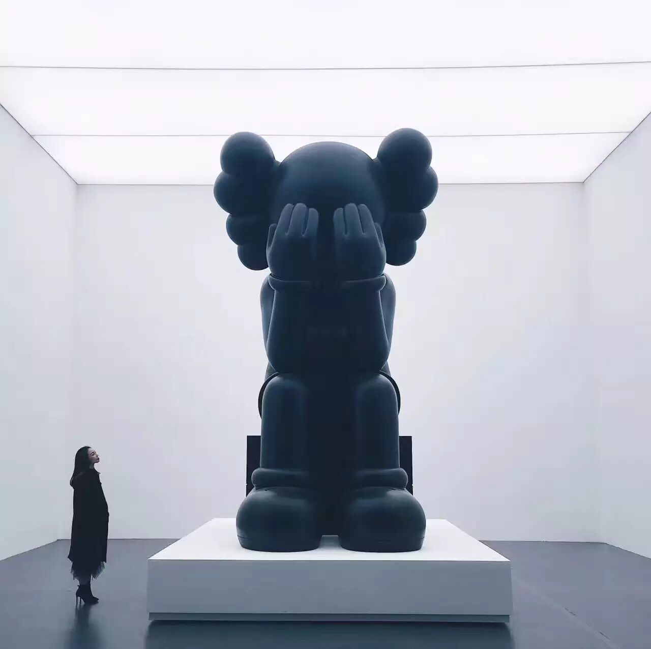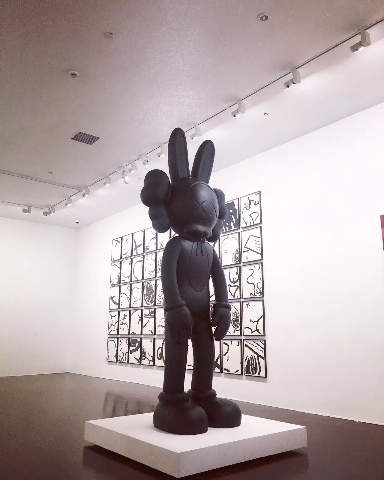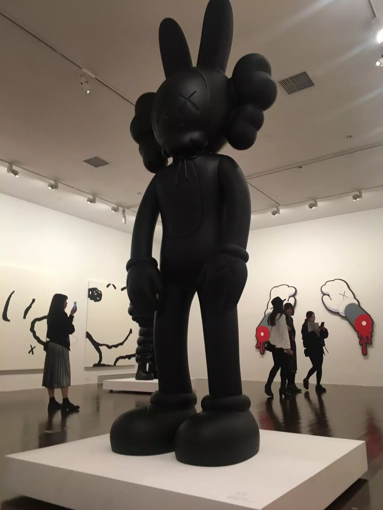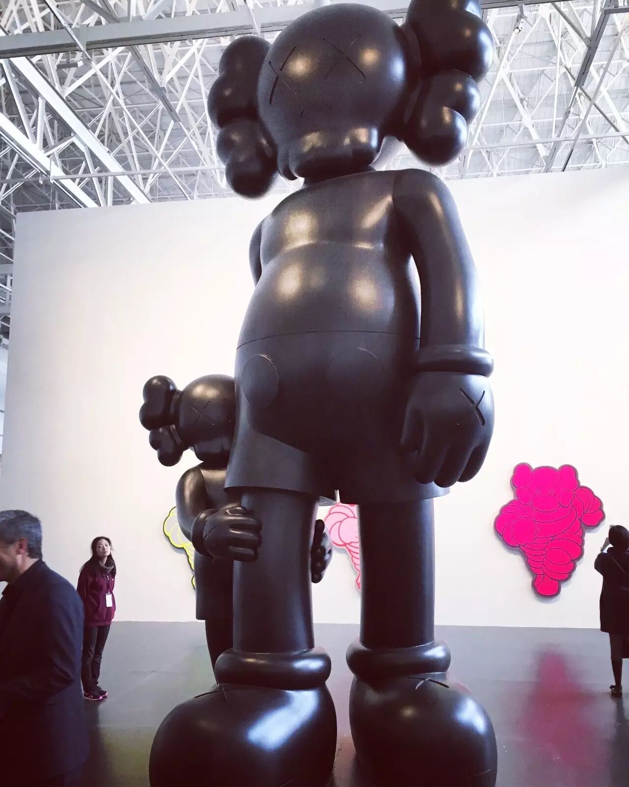 如果在人流高峰期间去观看 KAWS:始于终点,那必然不能按照正常的顺序观展!在这里,我建议女孩们,可以先去画作区好好地欣赏作品,然后再出来和雕塑合照哦~