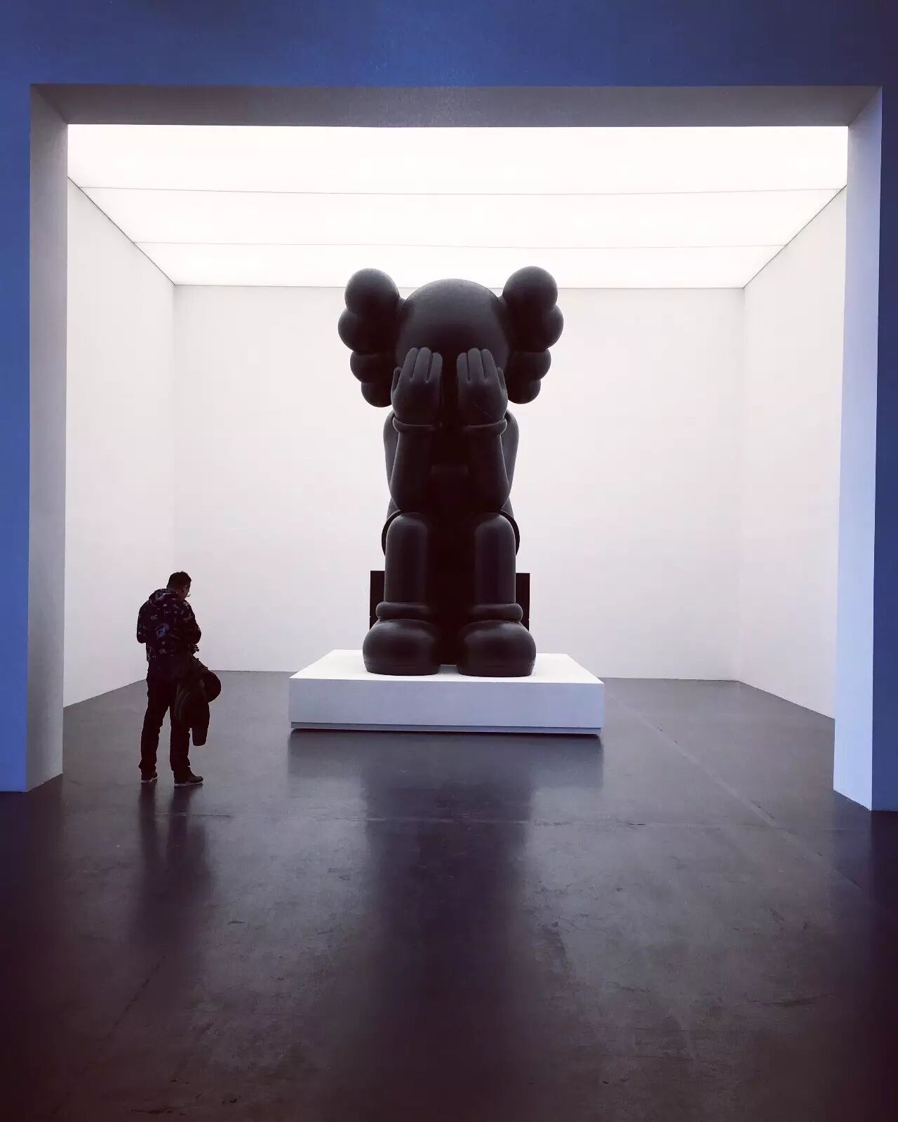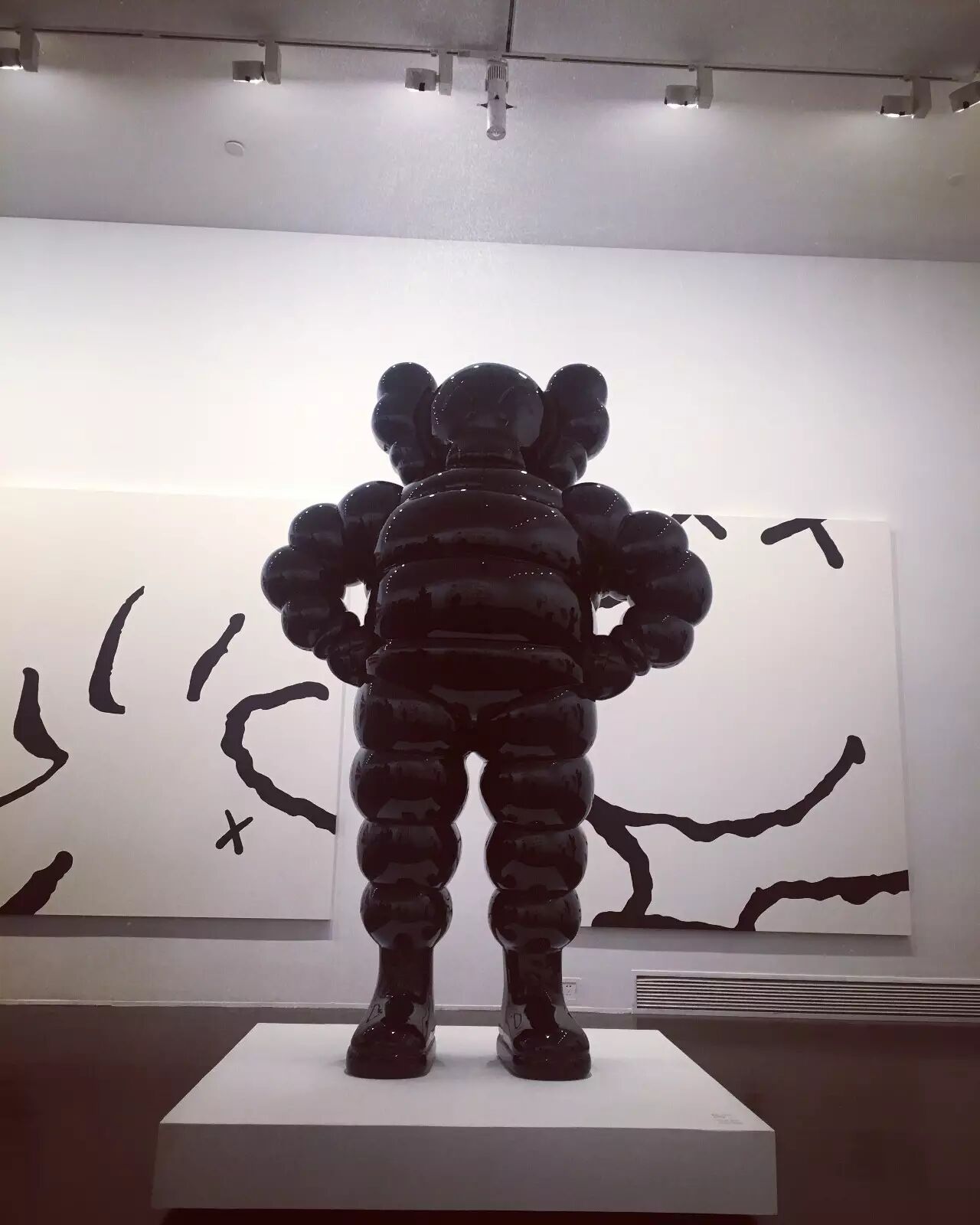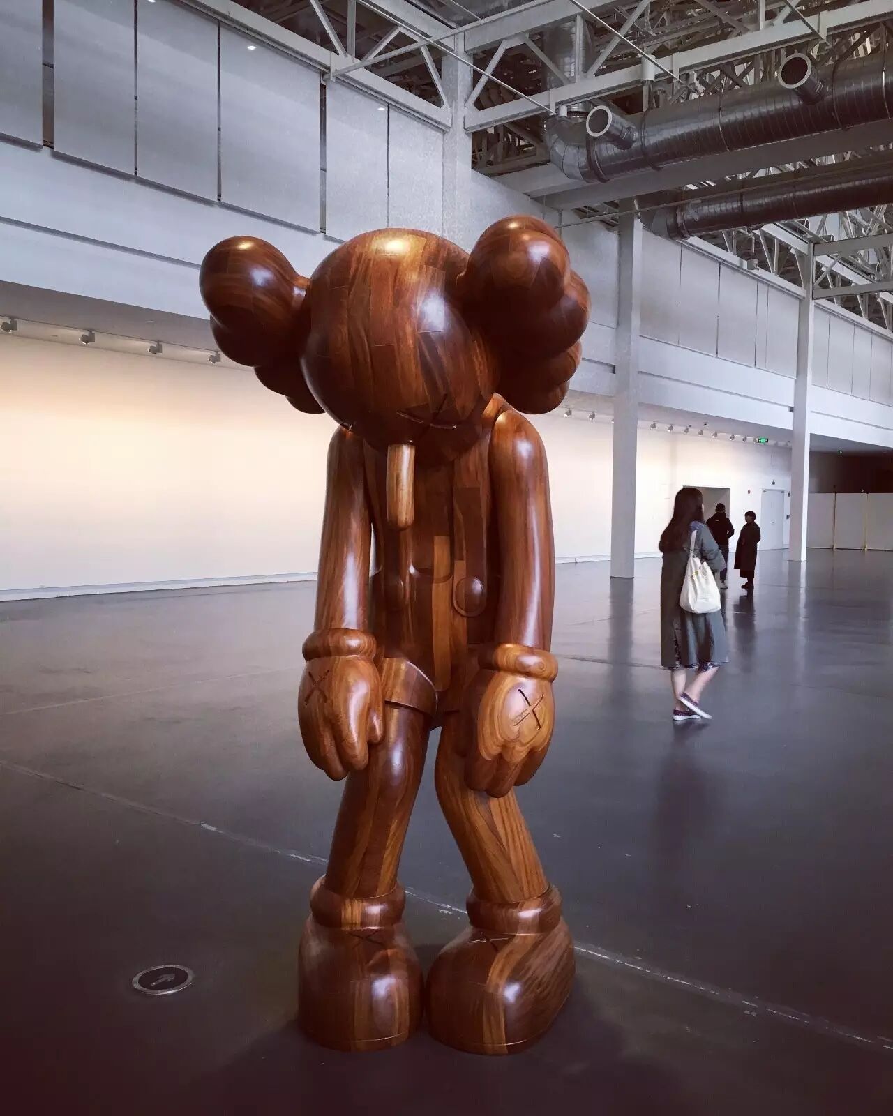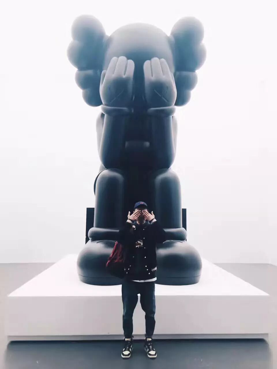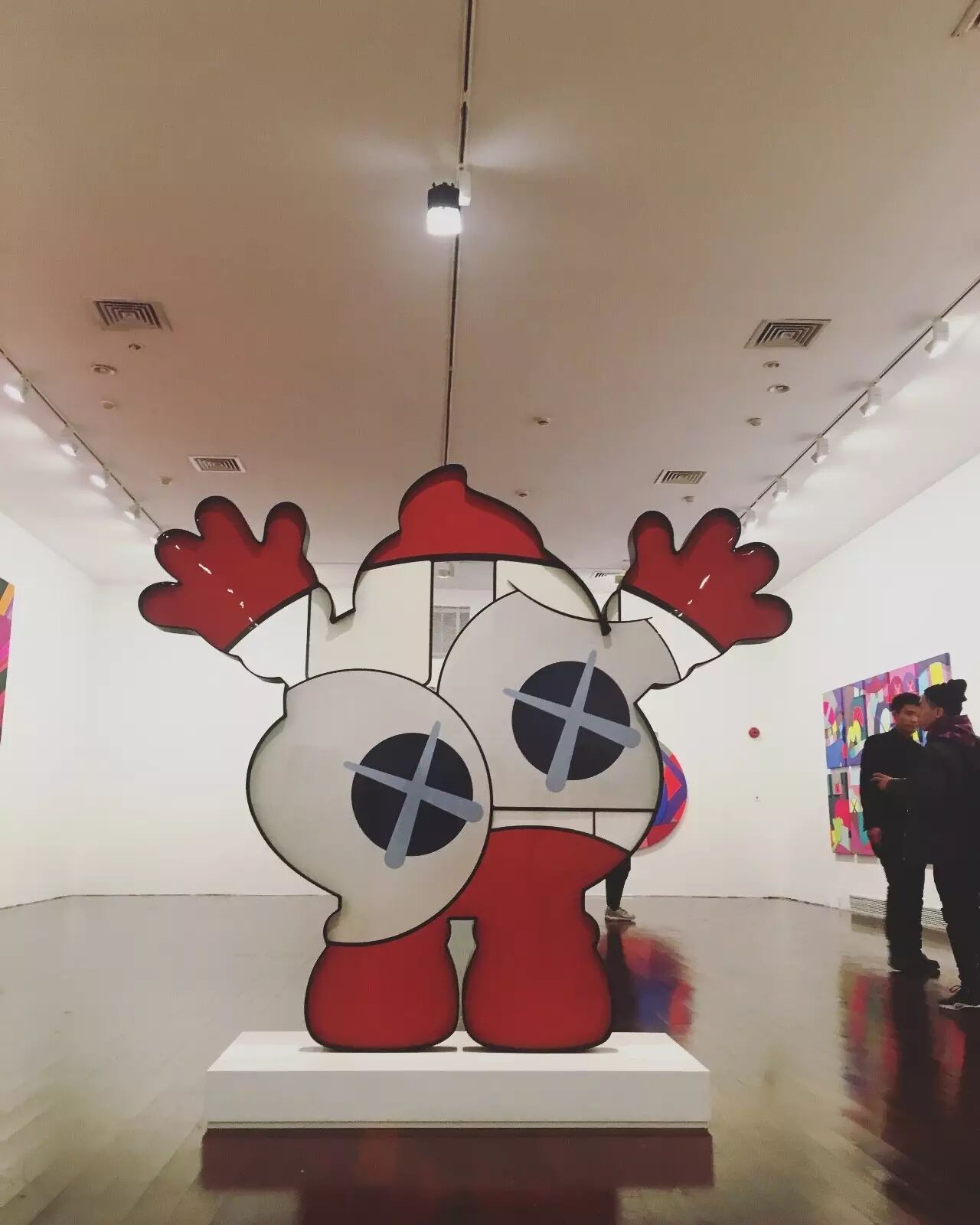 如果在人流高峰期间去观看 KAWS:始于终点,那必然不能按照正常的顺序观展!在这里,我建议女孩们,可以先去画作区好好地欣赏作品,然后再出来和雕塑合照哦~