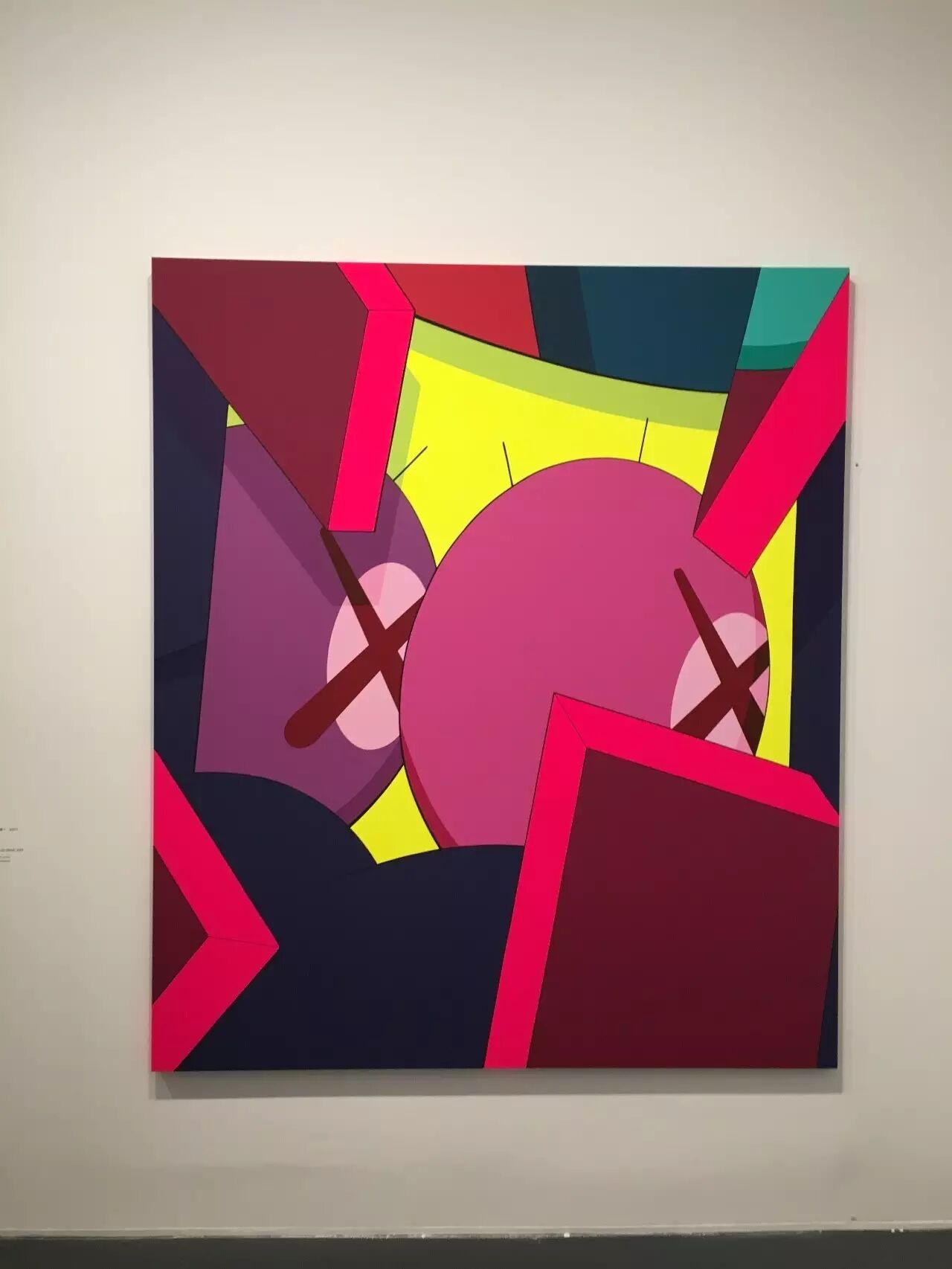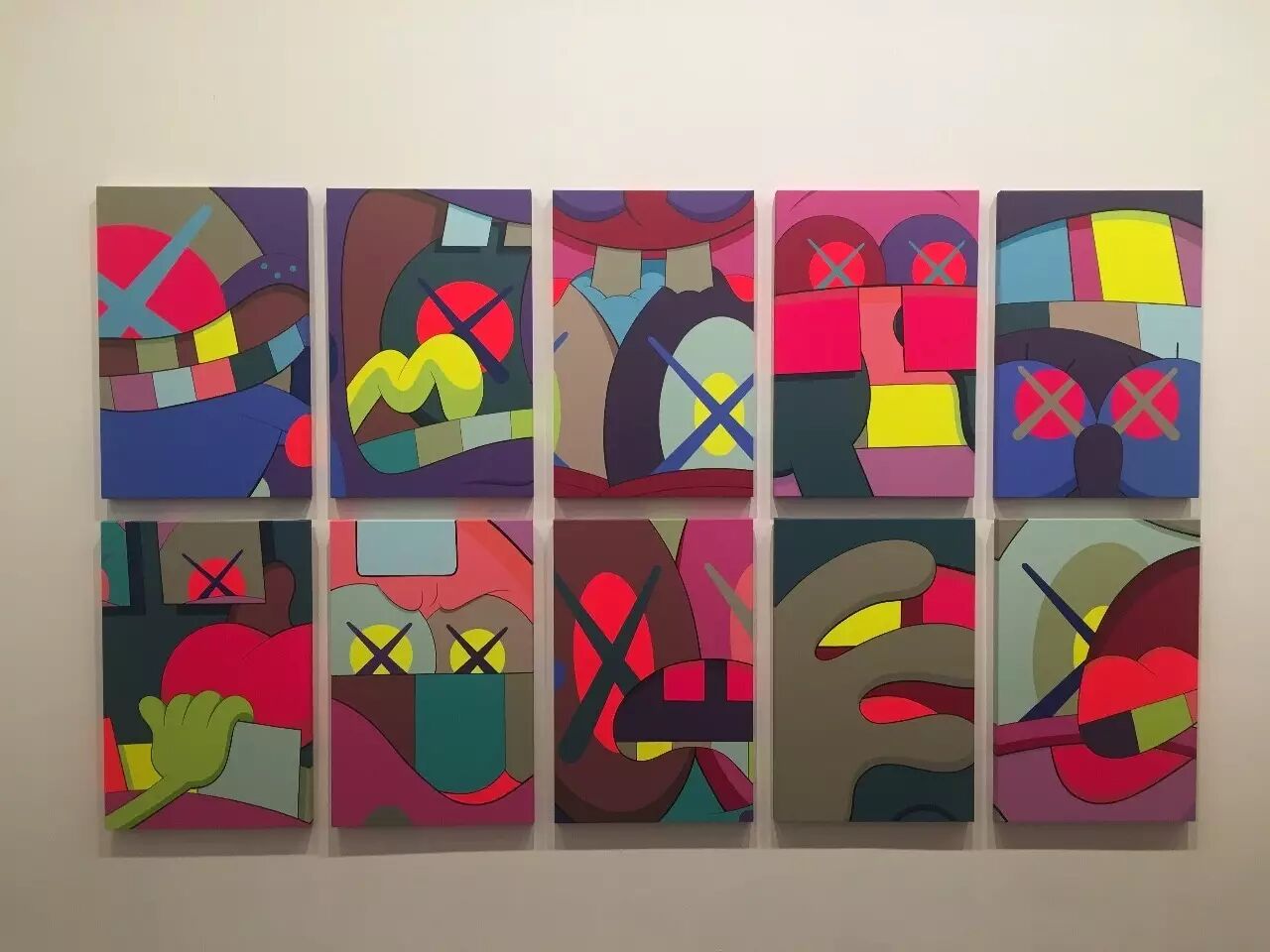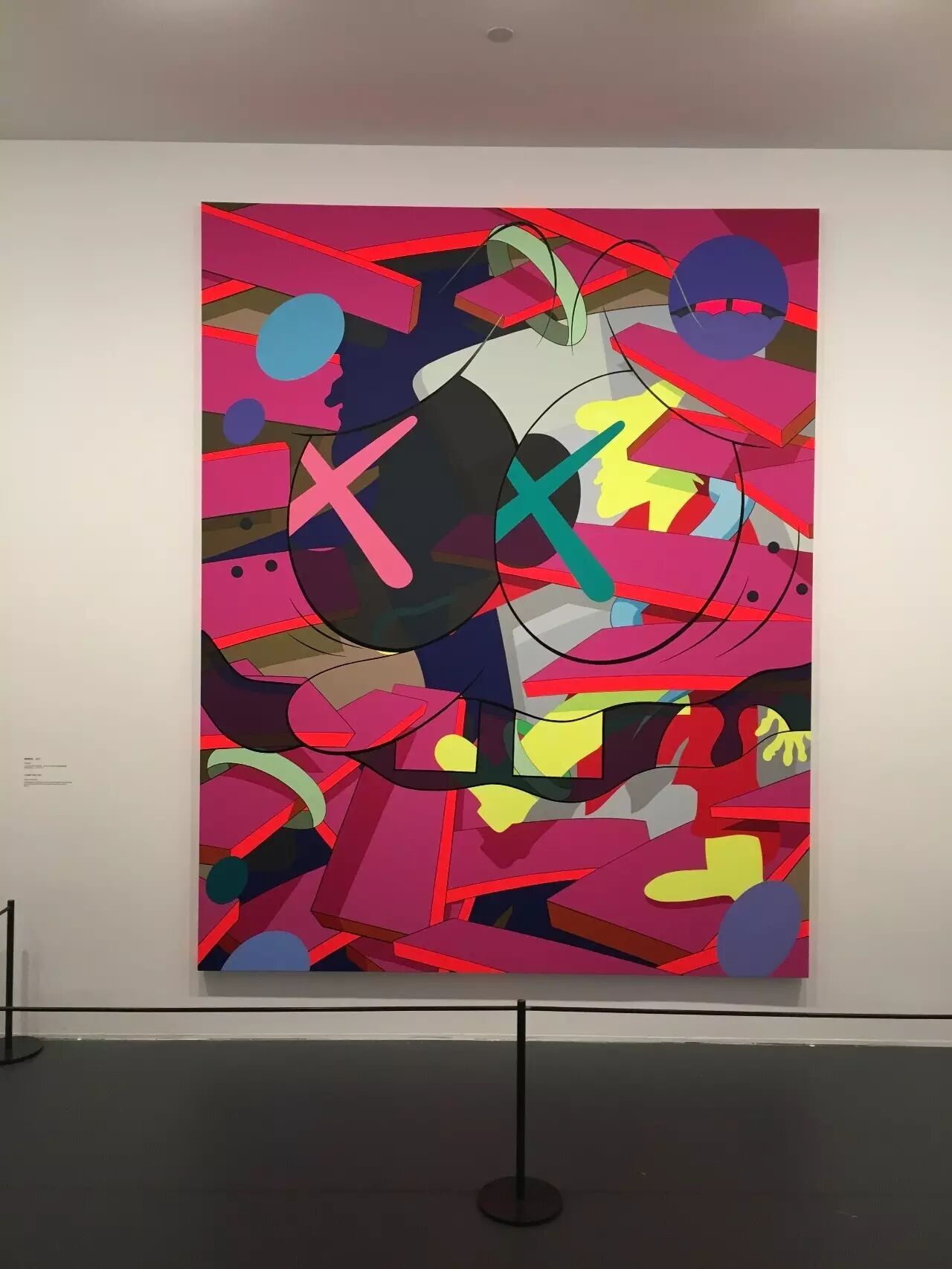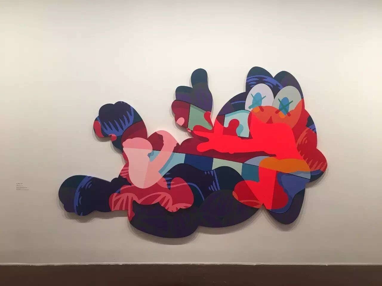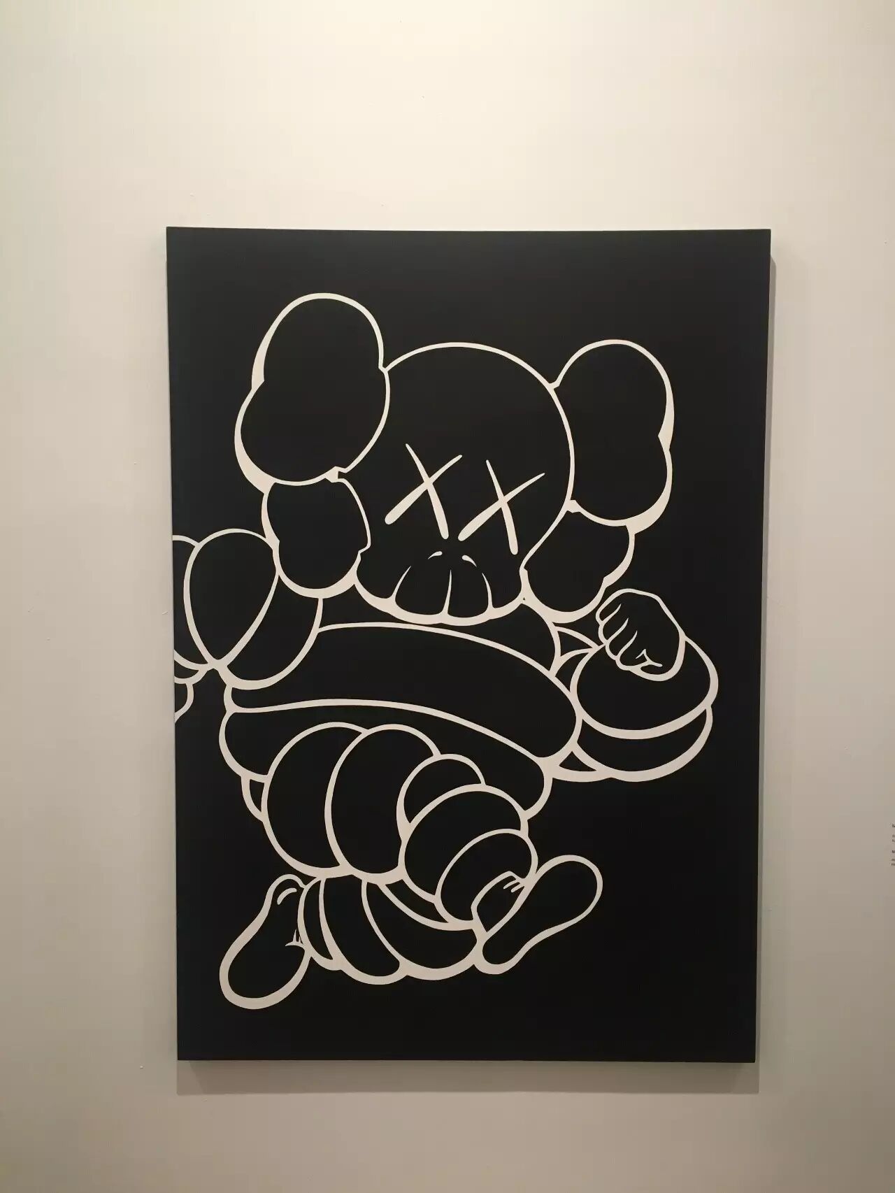 除了雕塑之外,最让我激动的,应该就是可以在展览中欣赏到KAWS近20年来的画作展示了!至今为止,KAWS的此类作品基本被分为前期以及后期。前期的作品都较为具象,基本以卡通人物为原型,一眼就能认出到底画了些什么的那种。