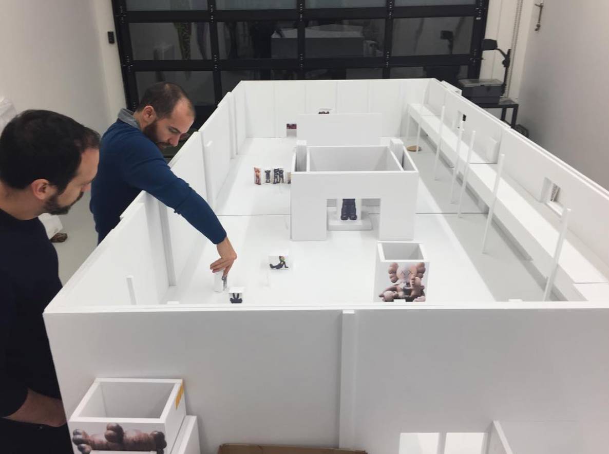 KAWS也同时在前两天上传了这张照片,并且标注为Installation day(搭建日),这些公仔以及产品也是不出意料地全部出现在了此次的 KAWS:始于终点 中。