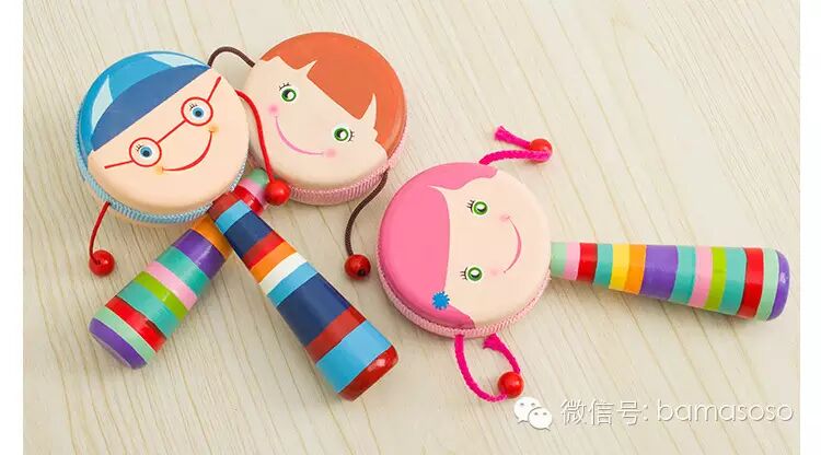 1、0-2个月摇响玩具(拨浪鼓、花铃棒等)摇动拨浪鼓,让宝宝寻找声源听觉能力