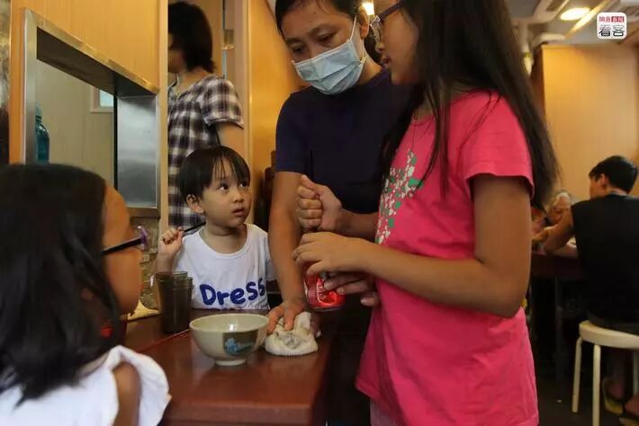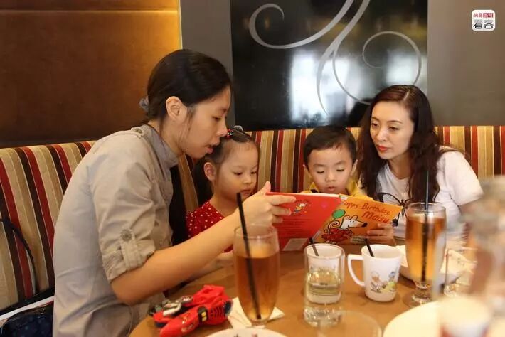 Vivian毕业于北外,讲一口流利的英语。这次聚餐,Candy特地带来儿子的课后作业让Vivian带着两个孩子读。在David和心雨班上,还有很多和他们一样父母来自大陆的孩子,他们要和其他国家的孩子一起学英语。虽然只有四岁多,但这些大陆二代的孩子大多已经开始报读课外的英语班。Candy说再过两年会让孩子学粤语,现在太小,同时学三种语言怕都学不好。图为两家新“港人”在一起聚餐。