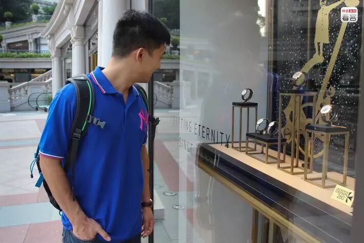 逛街中途,Allen说想和一个名表合影,因为他很喜欢但是一时半会还买不起。其实Allen对表颇有研究,他说现在有资源可以进到有折扣的名表,闲时就帮内地的朋友代购赚点零花,“现在确实不少人买这些贵的表”。图为Allen隔着橱窗望向名表店。