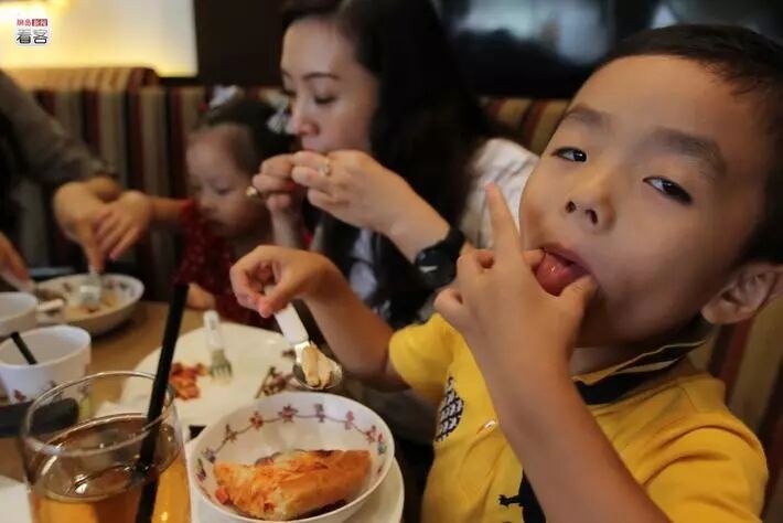 温习完作业,David和心雨最爱的披萨就上桌了。在吃披萨之前,David妈妈帮他去掉上面的肉和菠萝,“David就爱吃底下的饼,其实还是个北方的胃,上次带他去山东,他连吃了三张烙饼”。图为David在吃“披萨饼”。
