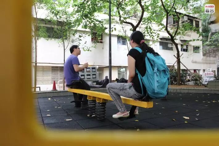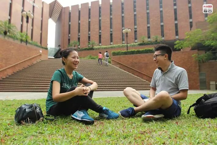 周末空闲时间,他们会到马峥的母校吃东西、会朋友和晒太阳,享受一下难得的夫妻时光。在香港,很多年轻人毕业多年后最喜欢的地方仍然是母校,在这座寸土寸金的城市,学校有稀有的矮楼绿地和放松的味道。图为龚杨和马峥在香港理工大学的草坪上坐着聊天。