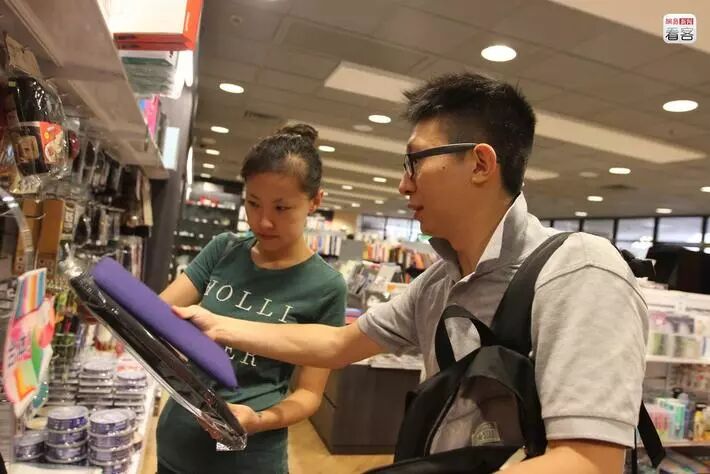 香港的学校基本都有书店和文具店,价格比起外面较为亲民,持学生证者还享有折扣。当天,龚杨想在这里买一个电脑包,后来马峥突然想到,她已经没有理工大的学生证了,转头对龚杨说:“算了,你还是回港大买吧。”图为龚杨在学校商店挑选一个电脑包。