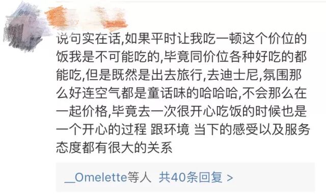 确实,从这一点上,迪士尼乐园是做的较为灵活的。因为根据迪士尼的门票使用规定,凭票进入迪士尼乐园当天,是有一次离开再返回的机会的。也就是说,游客可以凭借当天的门票在进入主题乐园游玩后,需要就餐时可以选择不在园区而是隔壁的迪士尼小镇或星愿公园用餐,用餐完毕后可重返乐园,只要不携带食物入园即可。这在一定程度上解决了一部分游客认为园区内餐饮贵且难吃的槽点。