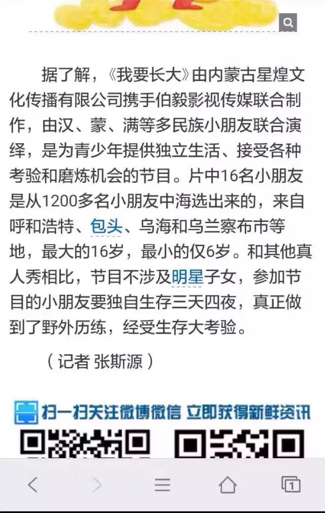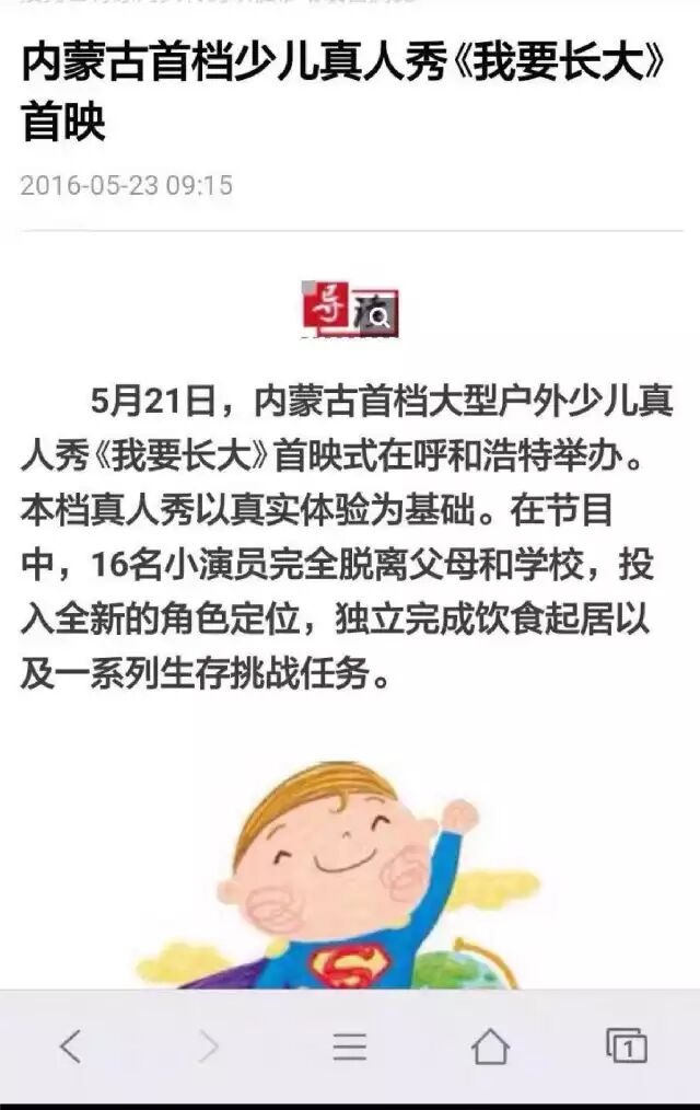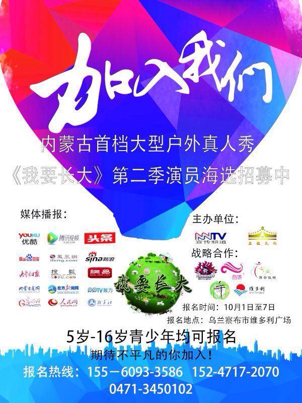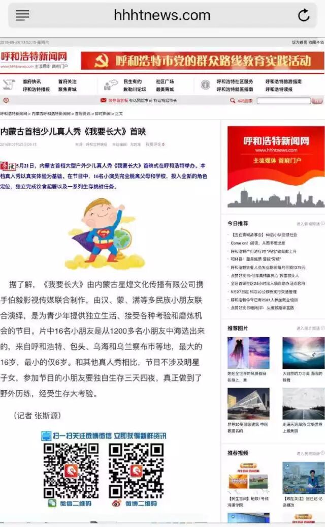 由内蒙古星煌文化传播有限公司携手伯毅影视传媒联合制作的内蒙古首档大型户外少儿真人秀《我要长大》栏目将于9月24日在“内蒙古卫视宣传频道播出”。