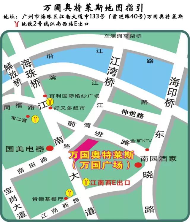 万国地址:广州市海珠区江南大道中133号万国奥特莱斯(地铁2号线江南西站E出口)