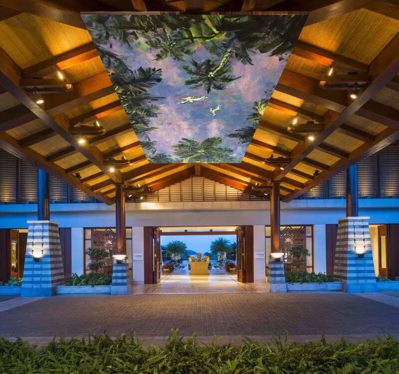 当你踏入酒店,一定能看到天花板上的艺术作品《椰风云影》。《椰风云影》长8米,宽4米,是墨骨油画创始人——李秀实先生应艾美酒店邀请,为其专门创作的一幅描绘海南热带风情的作品。