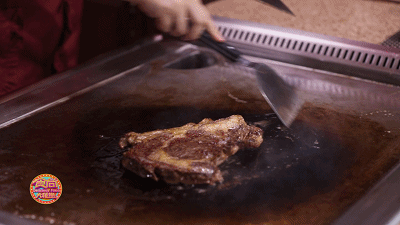 选用耐高温的黄油,滚烫的铁板瞬间将黄油烧化,再放入牛排,静置不动