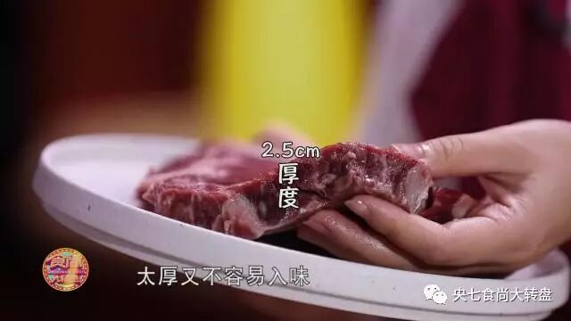 选好雪花牛肉之后,将牛肉切成2.5厘米厚(因为太薄容易变硬,太厚又不容易入味。)