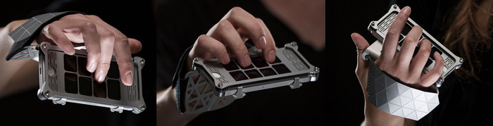 它由航空级铝制机身、弹性腕带、应用和云平台组成,其中手机的扩展配件部分像是一个有腕带的手机保护壳,不过它是结实的阳极氧化铝,,并使用激光切割以及数控冷弯机进行材料加工,控制器经过阳极氧化处理,表面光滑耐磨且抗腐蚀。屏幕部分有8个大小不一的方块,当下载了应用之后就用不同的手臂动作加上触摸不同的方块来演奏音乐,当然手机本身不发声音,可以无线连接一台笔记本电脑来控制发声,或者通过MIDI线连接其他设备。演奏完音乐后还可以上传到AUUG云上跟其他人分享交流。