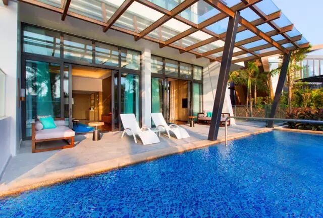 面积1800平米的沙滩泳池如同一轮明镜镶嵌在草坪上,置身于其中,抬起头,眼中或是自由自在的蓝天白云或是浩瀚无垠的银河星空,低下头,水面泛起浮光掠影,波光粼粼,远处眺望,是海棠湾壮丽的海景,侧耳聆听,传来阵阵海浪声在向你温柔絮语。