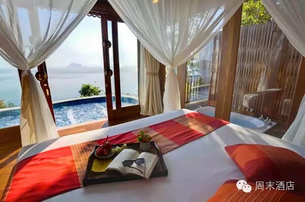 酒店位于Loh Pared海滩,距离普吉岛国际机场有50分钟车程和快艇船程。从机场到Ao Po Grand Marina Pier码头有30分钟的车程。从Ao Po Grand Marina Pier码头至酒店20分钟船程。总体来说很不错,只是来回路费较贵,酒店接送费用6000B/2人,自己上下岛约4000B(从芭东海滩出发)。住宿的地方在山坡上,很安静很舒适。房间也是全木设计,很温馨舒适,望出去的海面特别辽阔和平静。SANTHIYA酒店有三种房型,第一种是60多平方的豪华海景房,大概有60来间,每个房间都是面对大海,完全无遮挡,阳台上有浴缸和沙发,房间很宽敞。第二种是单卧别墅,带超大的泳池,大阳台,客厅等。有20来间。第三种是我们住的双卧泳池别墅,面积在300平左右分上下两层,楼上一层和单卧泳池别墅一样,室外大露台有餐桌,纳凉亭,和超大的泳池。室内有客厅,梳妆间和直接开门能跳进泳池的主卧室,还有露天面海大浴缸和超大超大的卫生间。