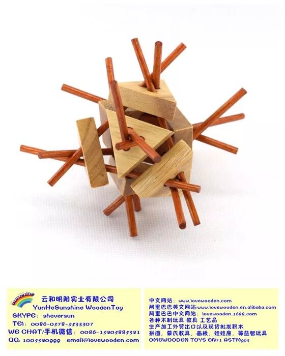 云和明阳实业有限公司主要加工生产经营批发木制玩具。主营产品有积木、拼图、绕珠、拼拼乐、迷宫、多米诺、过家家类、螺姆拼装、技巧球、孔明锁、音乐盒等益智早教木制玩具。产品资源丰富,价格合理,公司产品畅销消费者市场,孔明锁加工厂,远销美国、英国、日本等,在国内外市场都受到很大的欢迎,在消费者当中享有较高的地位。