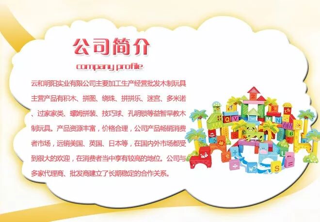 云和明阳实业有限公司主要加工生产经营批发木制玩具。主营产品有积木、拼图、绕珠、拼拼乐、迷宫、多米诺、过家家类、螺姆拼装、技巧球、孔明锁、音乐盒等益智早教木制玩具。
