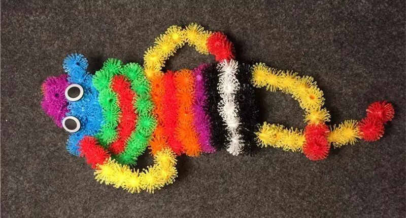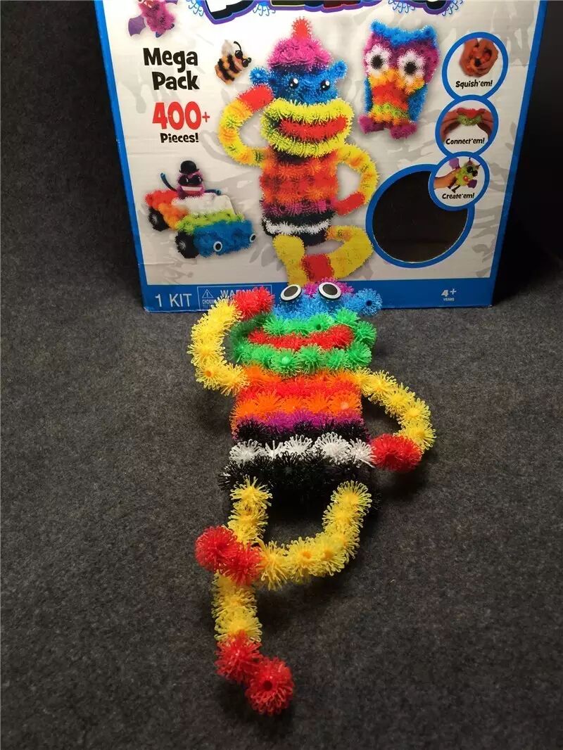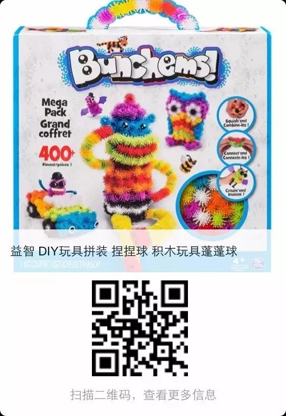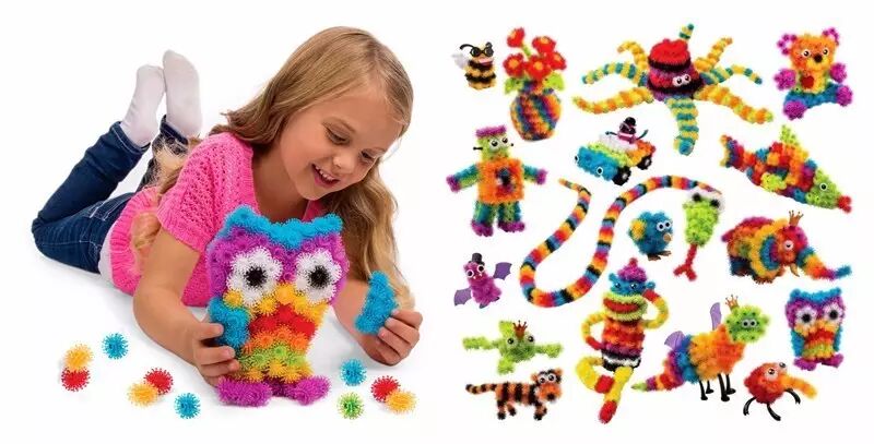 源自美国的拼装蓬蓬球,毛绒绒的看着好有想捏捏捏的冲动,一盒有红橙黄绿蓝紫黑白八色小球球共370个,还有36个肢体小配件,可以让孩子们脑洞大开,拼出各种小玩偶、小动物、小怪兽、小汽车……甚至可以几个小朋友一起拼出条五彩斑斓的小蟒蛇,想象力、创造力、感知力都在愉快的玩耍中得到锻炼,这不就是最自然的益智教育吗?