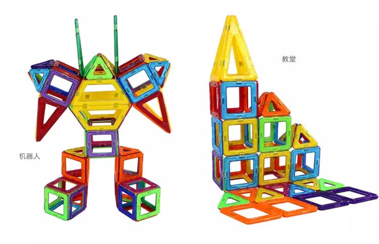 玩具介绍:磁力片玩具是由很多个不同的磁力片及配件构成,包括正方形、三角形、长方形、梯形、菱形、扇形等。用这些基础形状可以拼出无数的精彩造型,从而锻炼孩子的造型思维及创新能力。