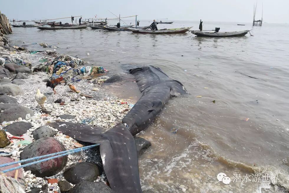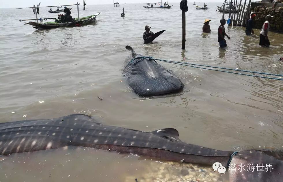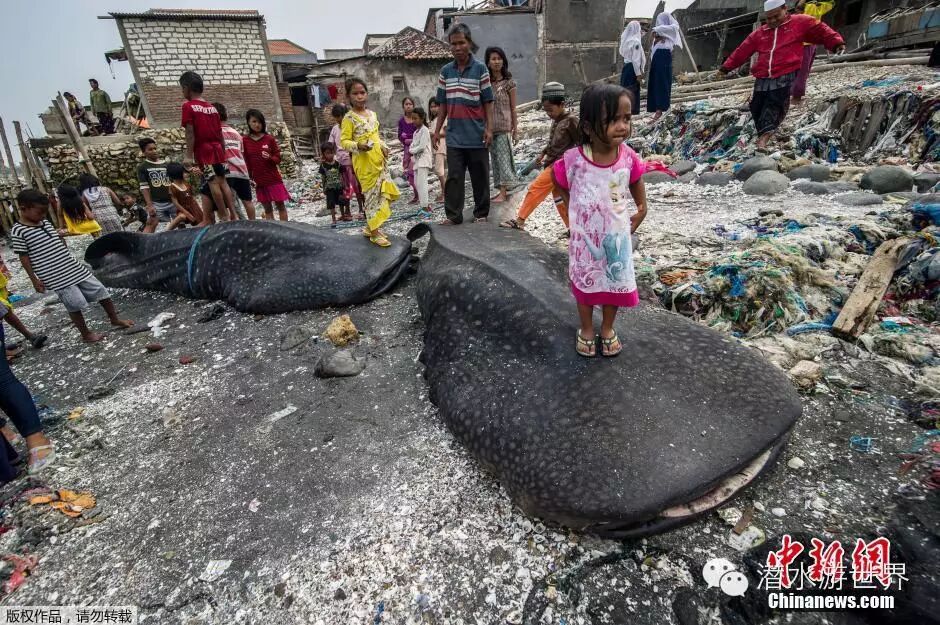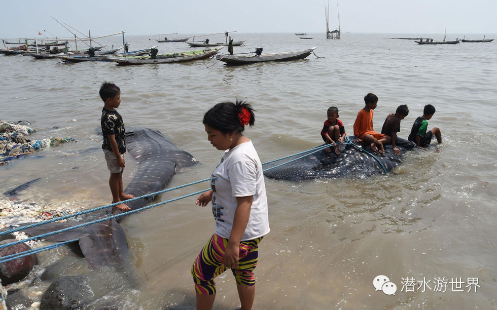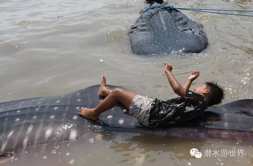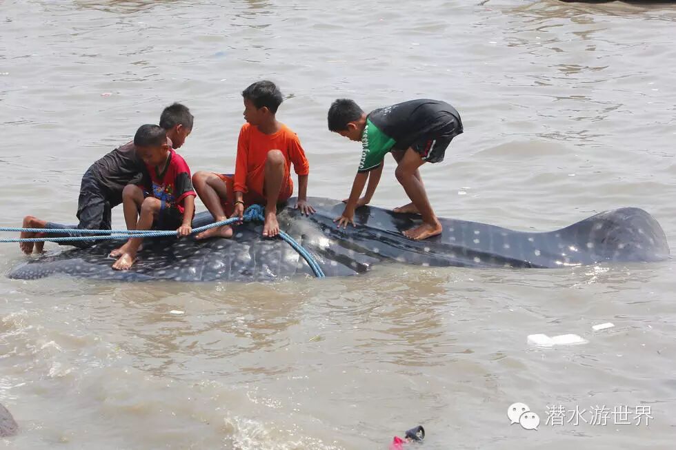 而当地渔民的孩子们踩在鲸鲨上玩耍,成为了孩子们的“玩具”。