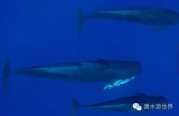 ▼公鲸鱼的嘴巴紧紧衔著幼鲸不肯放开,随著深蓝色海水的背景,令人看起来特别伤感。