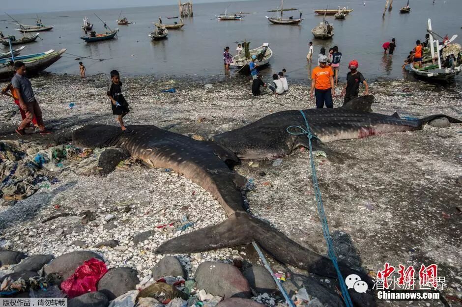 当地时间2015年10月26日,印尼泗水,渔民两天内在马都拉海峡用渔网捕到两头鲸鲨的尸体。