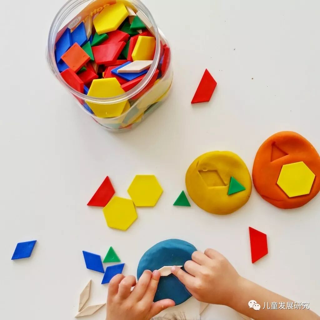 通过在橡皮泥上挤压出不同的形状,孩子能感受到橡皮泥的质地和模具的不同,还能认识不同模具挤压出的形状,当挤压模具其他表面时,会发生形状的变化,这样一个简单的游戏还能延伸到对三维图形的学习。