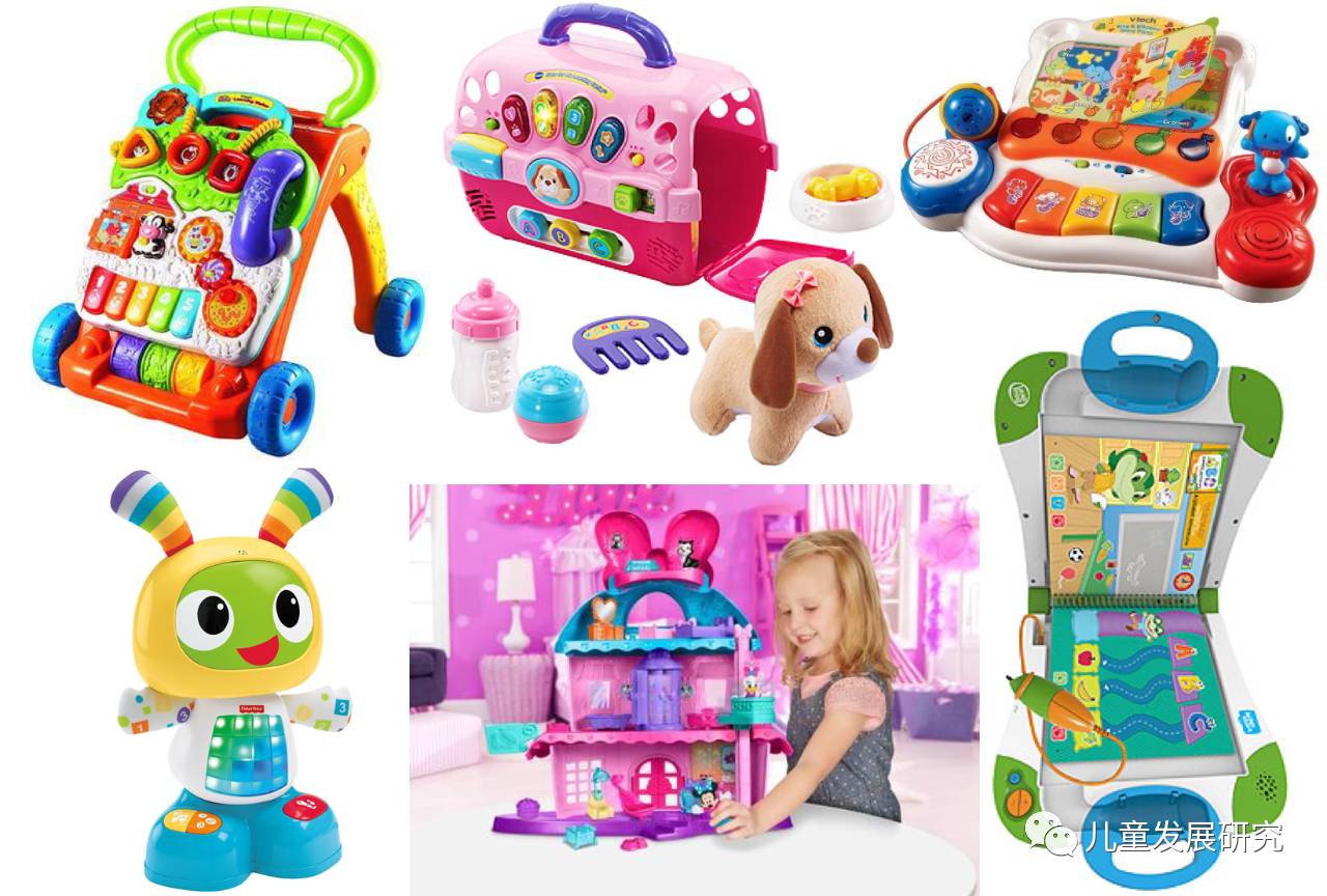 再来看这张图。这些是美国玩具巨头Toys"R"Us正在热销的幼儿玩具,色彩鲜艳丰富,大多有电子功能,不仅能动,还能播放音乐,发出声音,带孩子逛商场时绝对能精准无误吸引孩子眼球。市场普及率之高,相信不管你有没有孩子,一定见过类似玩具。