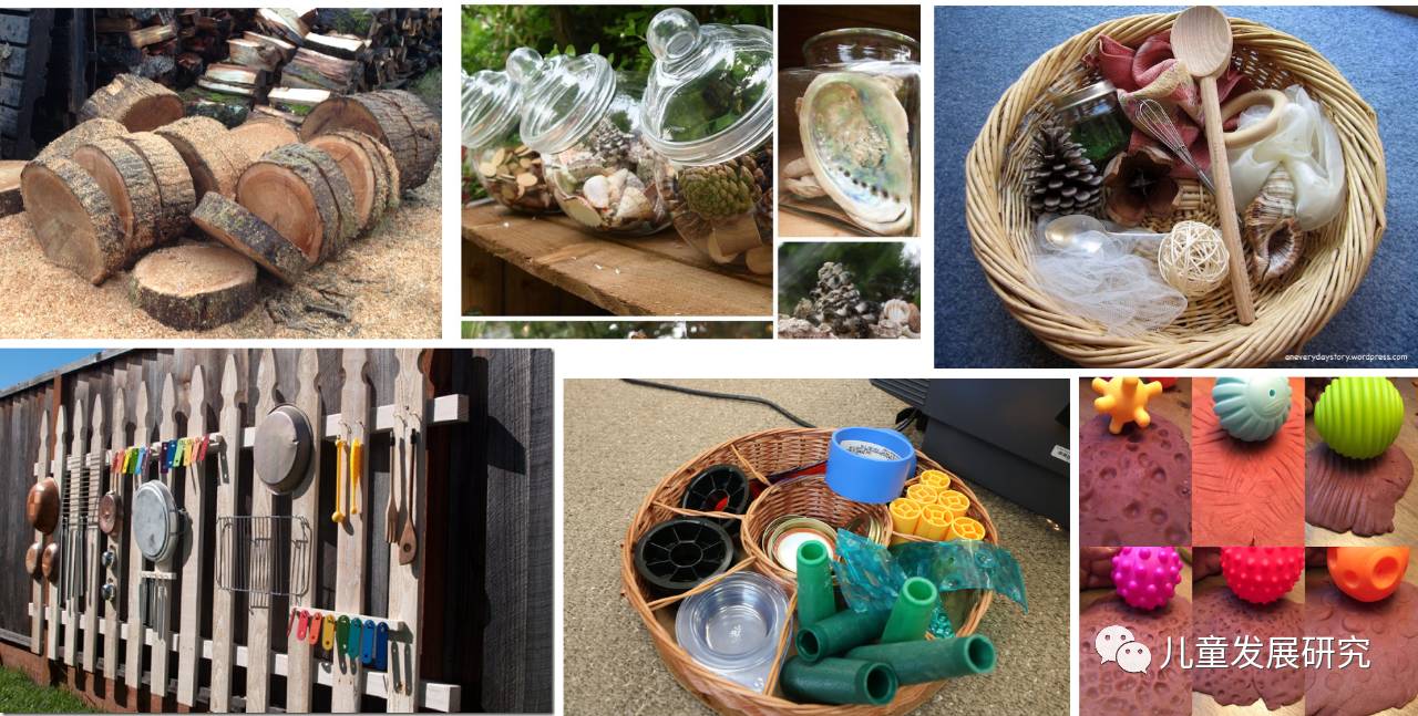 上面两张图都是来自大自然的玩具。大木桩可以满足孩子的攀爬需求,树林里的果子和树叶,海边捡的贝壳,不仅真实,也是很好的了解世界和学习语言的材料。你也可以收集各种家居用品,来满足感官探索。第二行最左是常见的厨具和餐具,可用来搬动和击打,探索声音的不同。废旧回收物料,只要确保安全和卫生,一样可以满足孩子的探索天性。