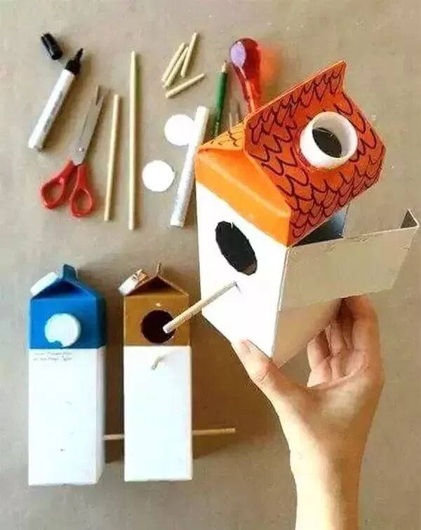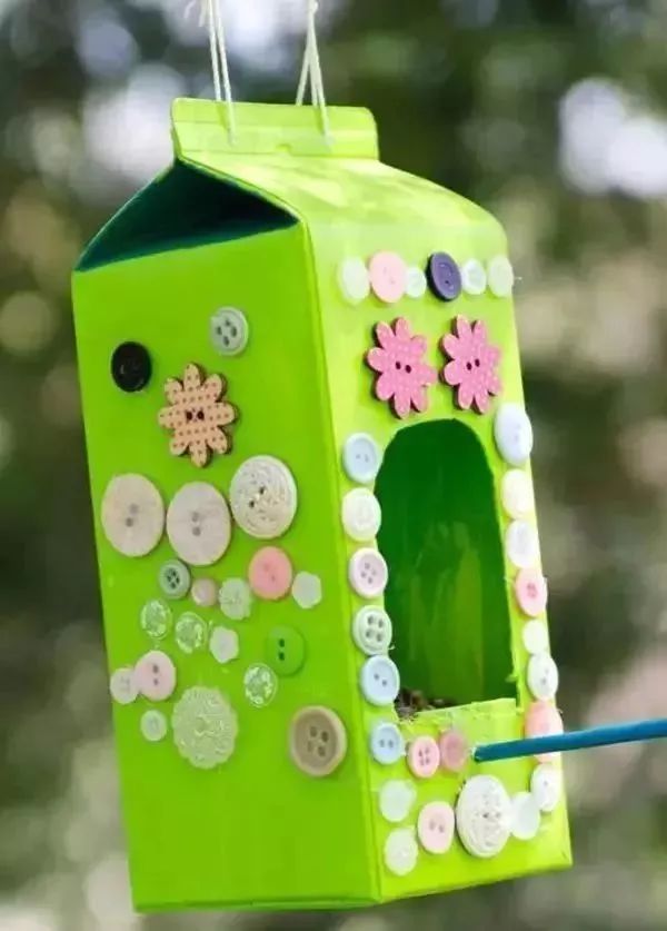 用牛奶盒做个捕食器,挂在室外,培养孩子的爱心,就从此时开始吧!