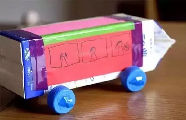简单的装饰下牛奶盒,小车玩具就完成了!真正参与到制作玩具的过程中, 玩起来也是意义十足的吧:)