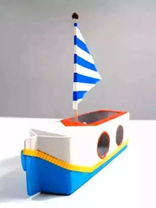 因为牛奶盒有防水的特点,所以特别适合当作DIY小船的材料。将牛奶喝刷成白色丙烯颜料