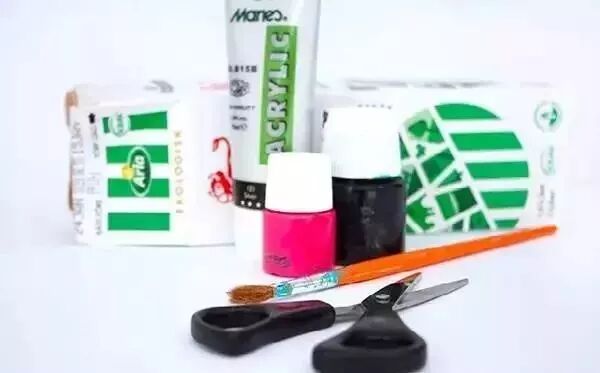 准备牛奶盒、丙烯颜料、剪刀、刷子