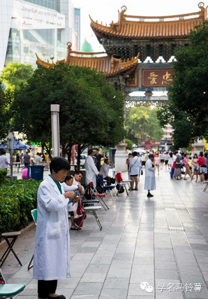 地图的下端有一条林荫大道,道的两旁二十几个按摩师穿着白大褂的等候或工作,像是穿着着制服的仪仗队,又有股小市民午后晒太阳般的惬意。不知这是自古留下的传统还是什么,起码给我的感觉还是非常新奇惊艳的。行人们突然抛却匆匆的旅程,上班的也忙里偷闲或是卸下一天的辛勤,老大爷老大妈应是专程跑来的。在这里按摩师们给他们舒活舒活筋骨,抖擞抖擞精神。我看见他们在低声交谈着什么,想是他们在舒适身体的时候,还享受着对心灵的轻轻推拿。