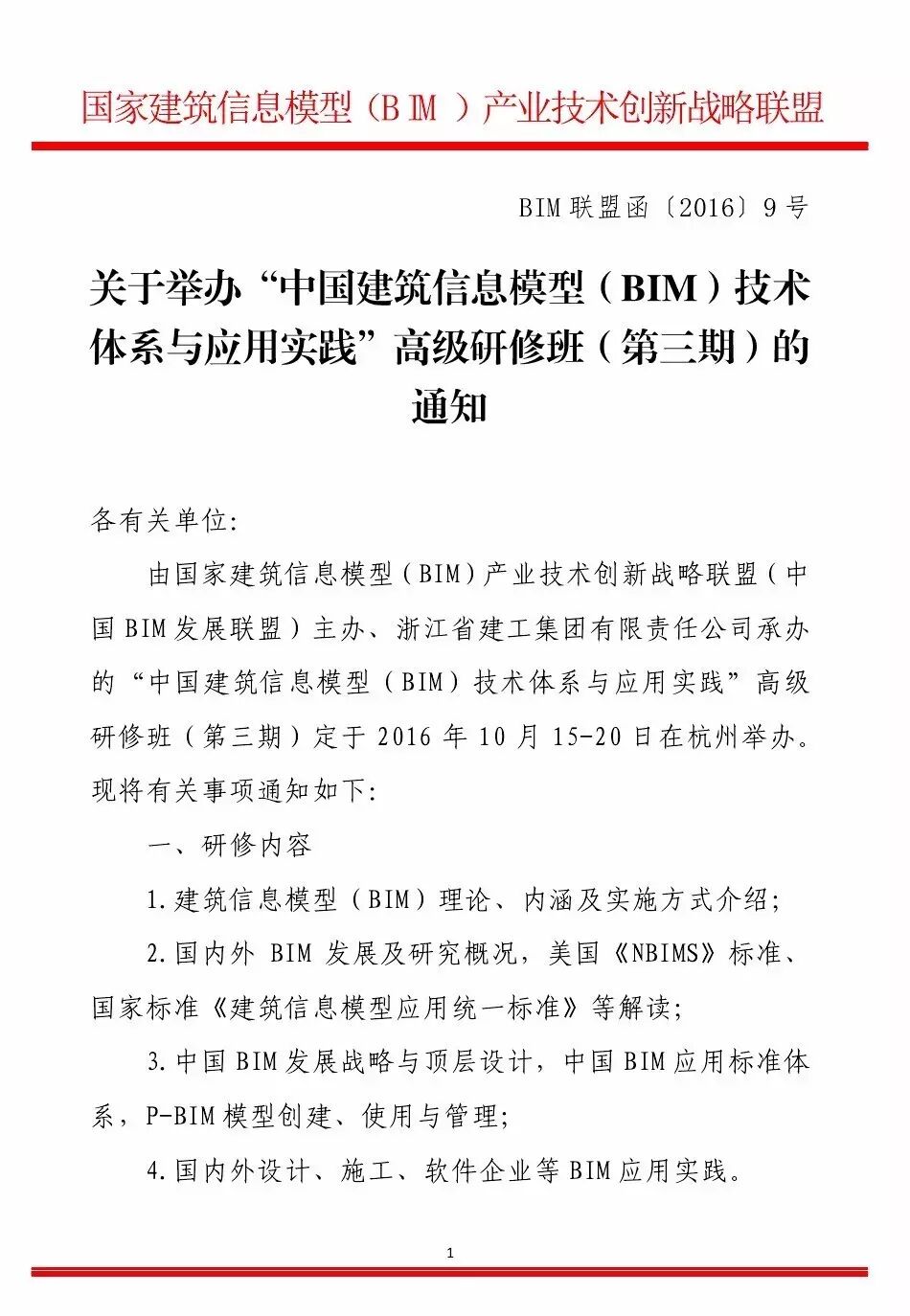 由国家建筑信息模型(BIM)产业技术创新战略联盟(中国BIM发展联盟)主办、浙江省建工集团有限责任公司承办的“中国建筑信息模型(BIM)技术体系与应用实践”高级研修班(第三期)定于2016年10月15-20日在杭州举办。现将有关事项通知如下: