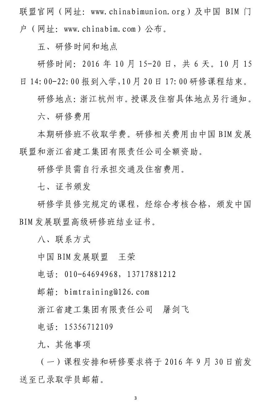 本期研修班不收取学费。研修相关费用由中国BIM发展联盟和浙江省建工集团有限责任公司全额资助。