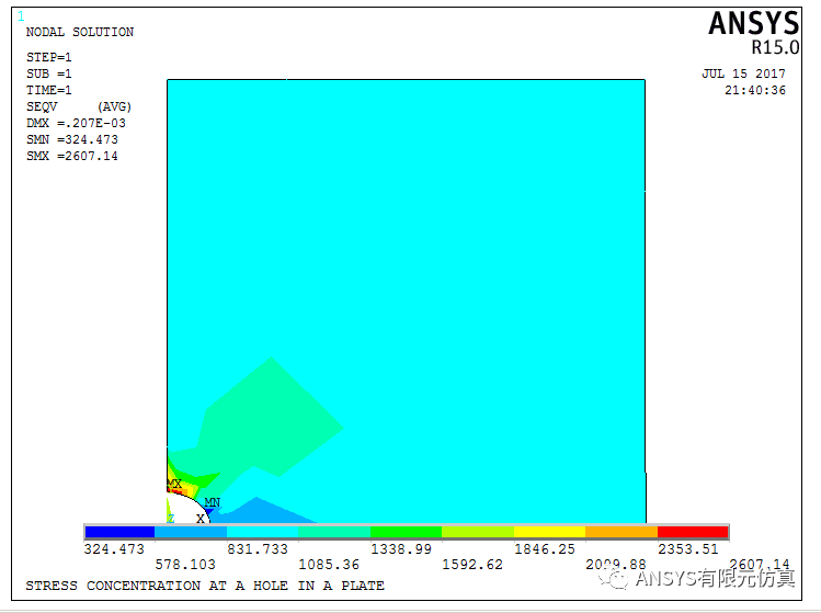 首先,我们对模型进行网格的粗糙划分,迅速求解结果。如上图所示,应力集中在孔的Y方向,应力最大为2607。