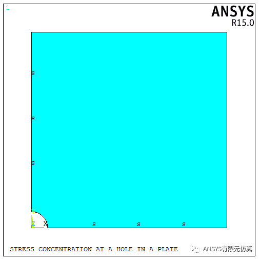 下面通过一个具体的实例,来讲解子模型技术的应用。矩形平板中心开孔,承受横向拉力时的应力集中情况。由于对称,选取模型的四分之一进行分析。