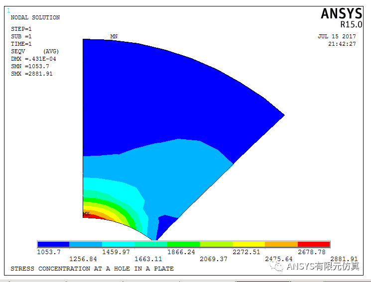 在对粗糙网格划分之后,我们选取孔的上部分区域,进行网格的重新划分,计算结果如上图所示,应力集中依然在孔的Y方向,最大内应力为2881。