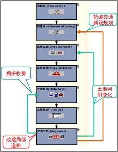 本次模型设计了先进的模型流程管理方法,不仅使模型应用者能够清晰了解模型结构,进行模型结果的联调联试,方便在开展不同项目时进行计算模块的选择,减少不必要的重复计算,提高模型的管理水平和反应速度。例如进行一个轨道交通新线的规划项目,类似新的轨道线路这样的重要交通设施会改变交通网络的出行成本,而一条小的支路的打通可能影响的只是局部地区的道路交通流量,因此两类项目所需要进行计算模块和步骤是完全不同。