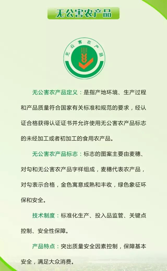 无公害农产品 | 绿色食品 | 有机食品 (产品) | 农产品 地理标志 | |