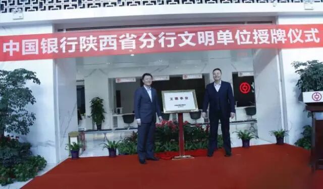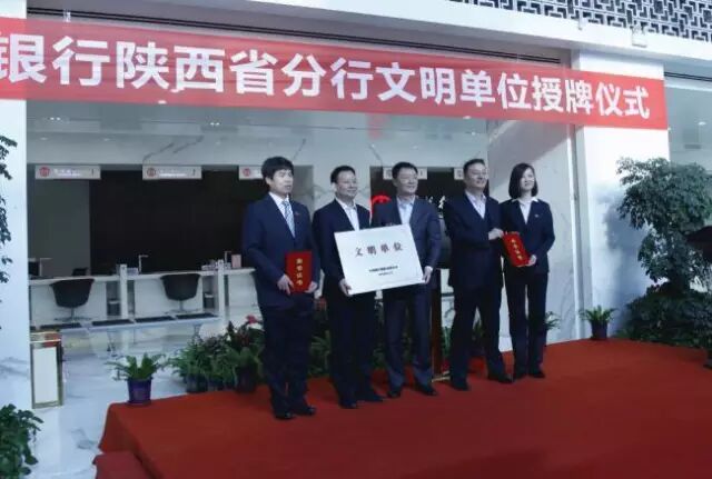 陕西省分行党委书记吴敏(右一)授予总行级文明单位称号的机构负责人荣誉证书