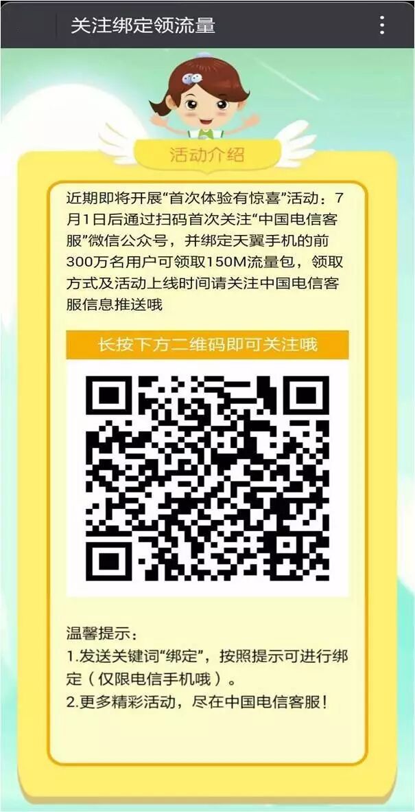 关注方法点击上方篮字“中国电信贵港分公司”或点击识别下方二维码进入贵港电信微信公众号