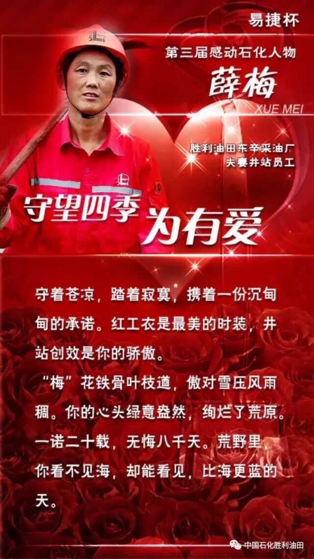 她是薛梅,中国石化胜利油田东辛采油厂营二管理区营8更9井站采油工。她的敬业故事,感动了你我,感动了石化。3月17日,易捷杯第三届“感动石化”人物评选结果揭晓,薛梅获此殊荣。