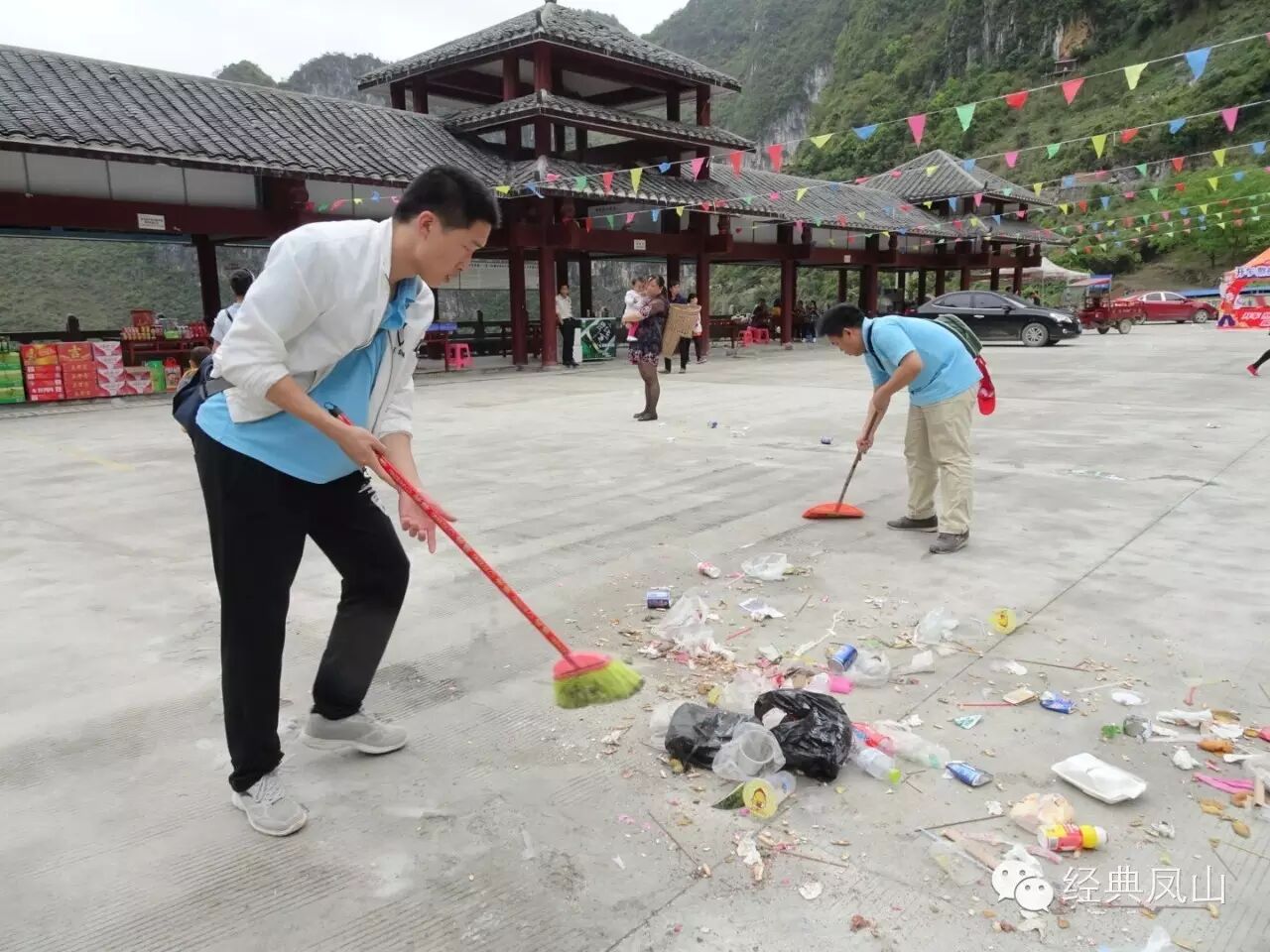 图为:志愿者在清理现场