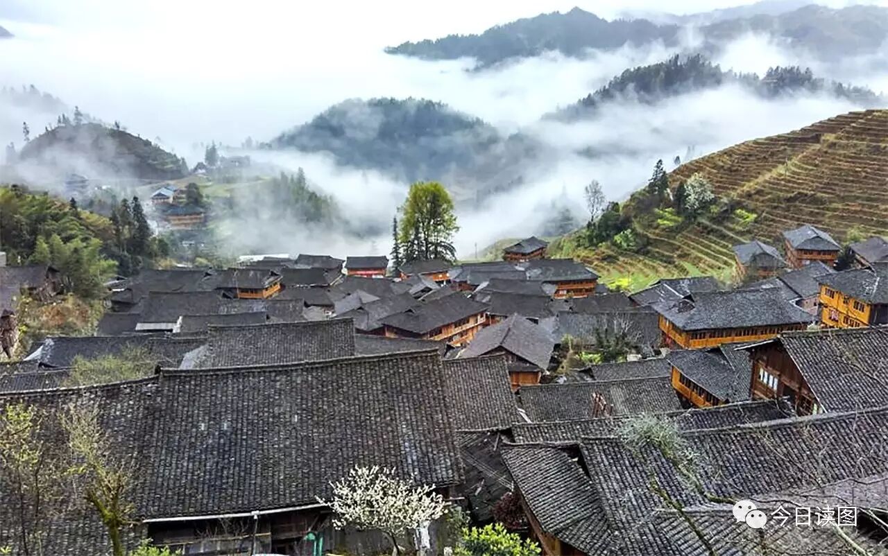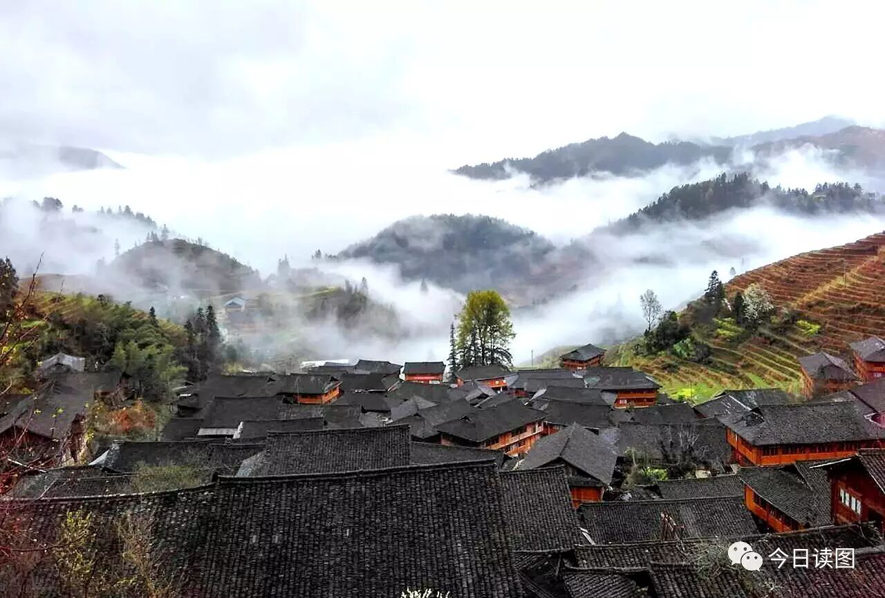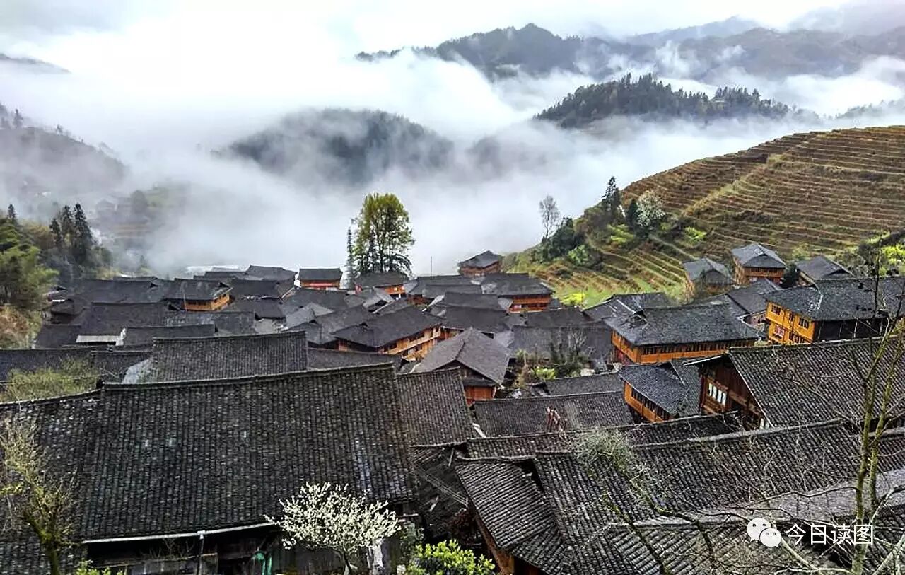 龙胜县龙脊镇小寨村雨过天晴、云雾缭绕,当地的吊脚楼、梯田、古树和簇拥绽放的李花在云雾中若隐若现,宛如一幅美丽的山村水墨画映入眼帘,让人赏心悦目。(潘志祥 摄 )