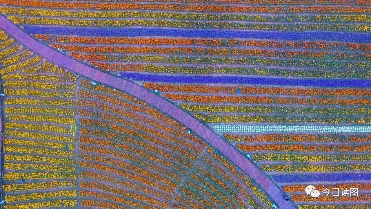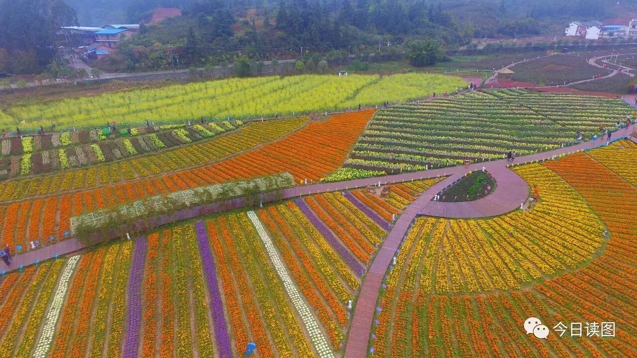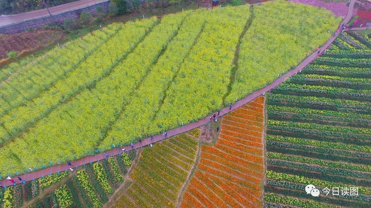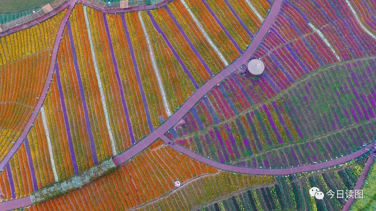 春暖花开时节,广西贺州市昭平县黄姚镇400亩花海各色鲜花竞相开放,从空中俯瞰,犹如大自然的调色板,色彩斑斓,吸引众多游人纷至沓来踏青赏花。(谭凯兴 摄 )