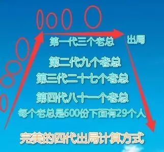 现在你是16233份的高级业务员,你的3 个直接都是5404份的高级业务员。这个时候团队在发展的话,你就该拿高级业务员最后的一代销售补助19元了。拿多少呢?拿到你出局为止。什么时候出局?就是你的3 个直接都要拿高级的第三代销售补助时,你就出局了。和前面一样,你的3个直接业务员要拿第三代销售补助,必须拿完3603份*3=10809份第二代销售补助,这样意味着你要拿高级业务员的第三代销售补助19元*10809份*3=616113元。拿完代表着你成功出局了。