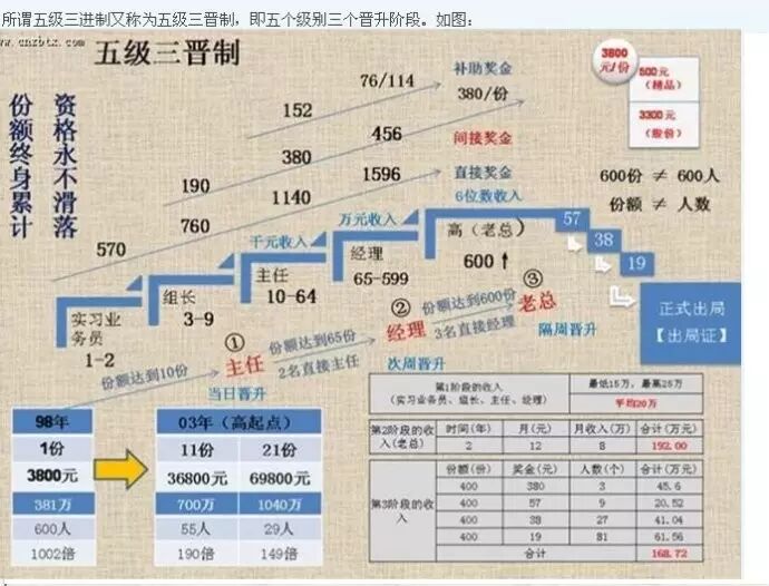 这1210元给厂家了吗?不可能,没有找厂家买产品为什么要给厂家?那么到哪里去了呢?细心的朋友可能注意到,如果把所有的直接提成/间接提成/销售补助/效益分红全部加起来是 15%+5%+10%+12%+10%+4%+3%+2%+1.5%+1%+0.5%+3%=67%, 实际参与奖金分配的额度是67%而不是55%。3800元*(67%-55%)=456元,也就是说如果做一份,那么厂家还要从45%里面拿出额外的12%参与体系的奖金分配,如果投资的份额超过2份,从第2份开始厂家将从1210元里面拿出456元参加体系的奖金分配,剩下的754元除了厂家留下极少的管理费用外,其它是全部返给投资超过1份的高级业务员的。返给高级业务员多少?这个没有统一的标准,这个根据体系和地方税务局的不同,计算的系数有少许差别。以广西为例,大多数体系的返点是550元,上高级需要600份,也就是说会多出600*500元=33万元,也就是说每多做一份你将可以多挣33万元,而这个返点是不要缴税的。