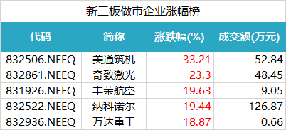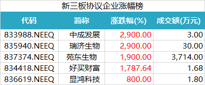瑞济生物(835940.NEEQ),中成发展(833988.NEEQ)今日上涨2900%,分别成交30万元,3万元,居涨幅榜首位。苑东生物(837374.NEEQ)、好买财富(834418.OC)分别上涨1900%、1787%,成交金额分别为3714万元、1.68万元。